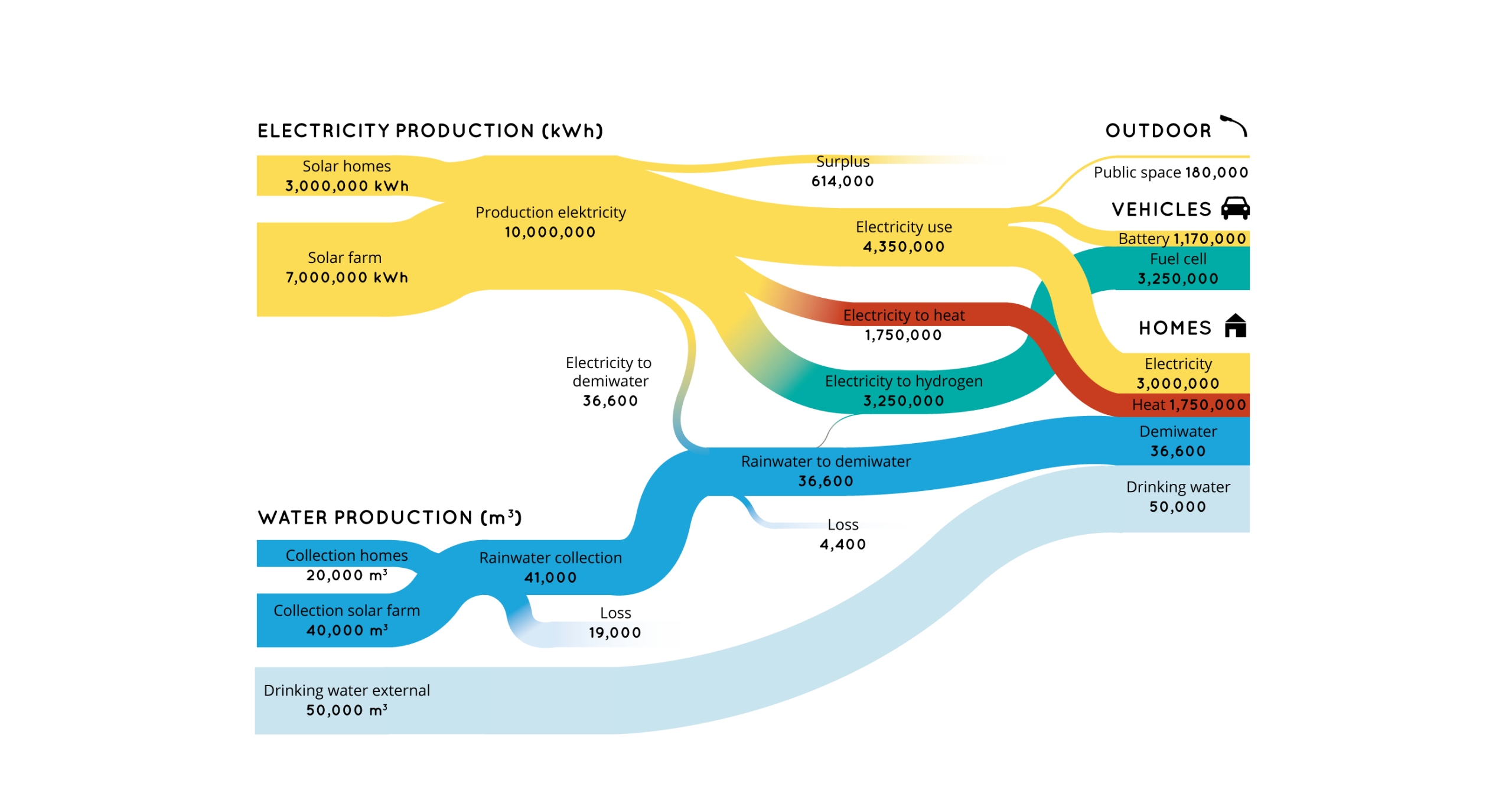 Nine hundred homes equipped with solar cells and rainwater harvesting systems, in an 8.6 megawatt-peak (MWp) solar park with rainwater harvesting, will together produce 10 million kilowatt hours (kWh) of electricity and 60,000 cubic meters of rainwater annually. This is enough to satisfy all of the homes’ energy needs, be it for heating, electricity or mobility. For the first time ever, solar energy and rain will be used in the project to produce electricity, heat, hydrogen and demiwater for people in a new housing development. In other words: Solar Power to the People: bringing energy from the sun to people, wherever, whenever and in whatever form they need it.